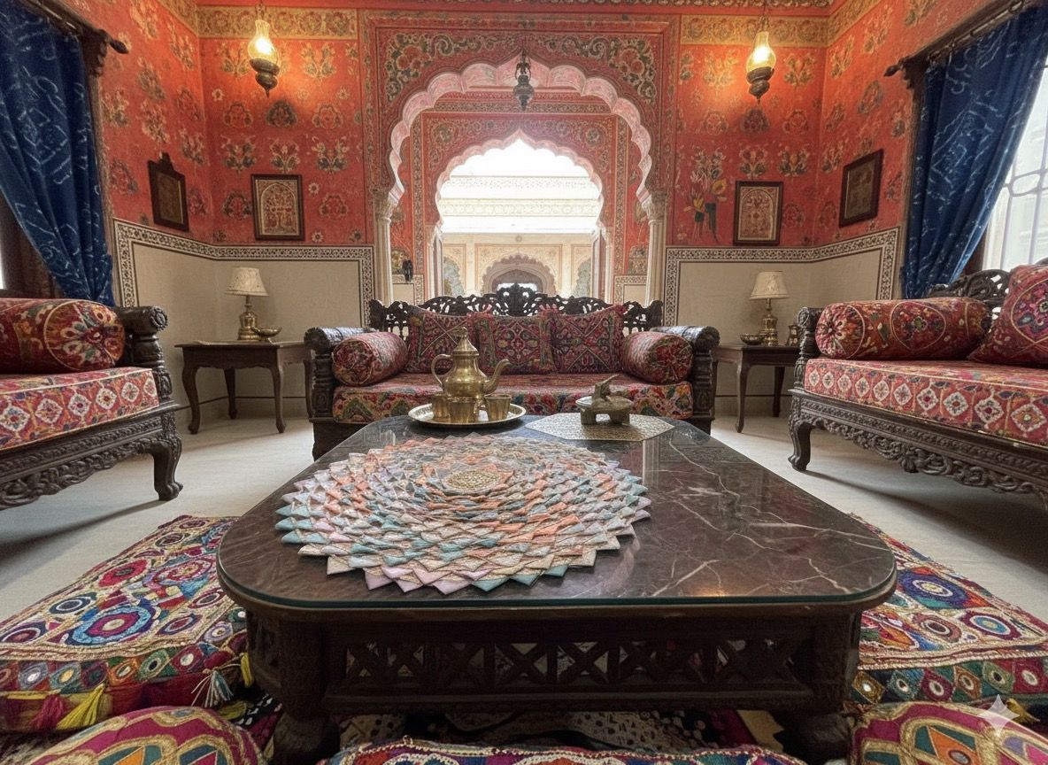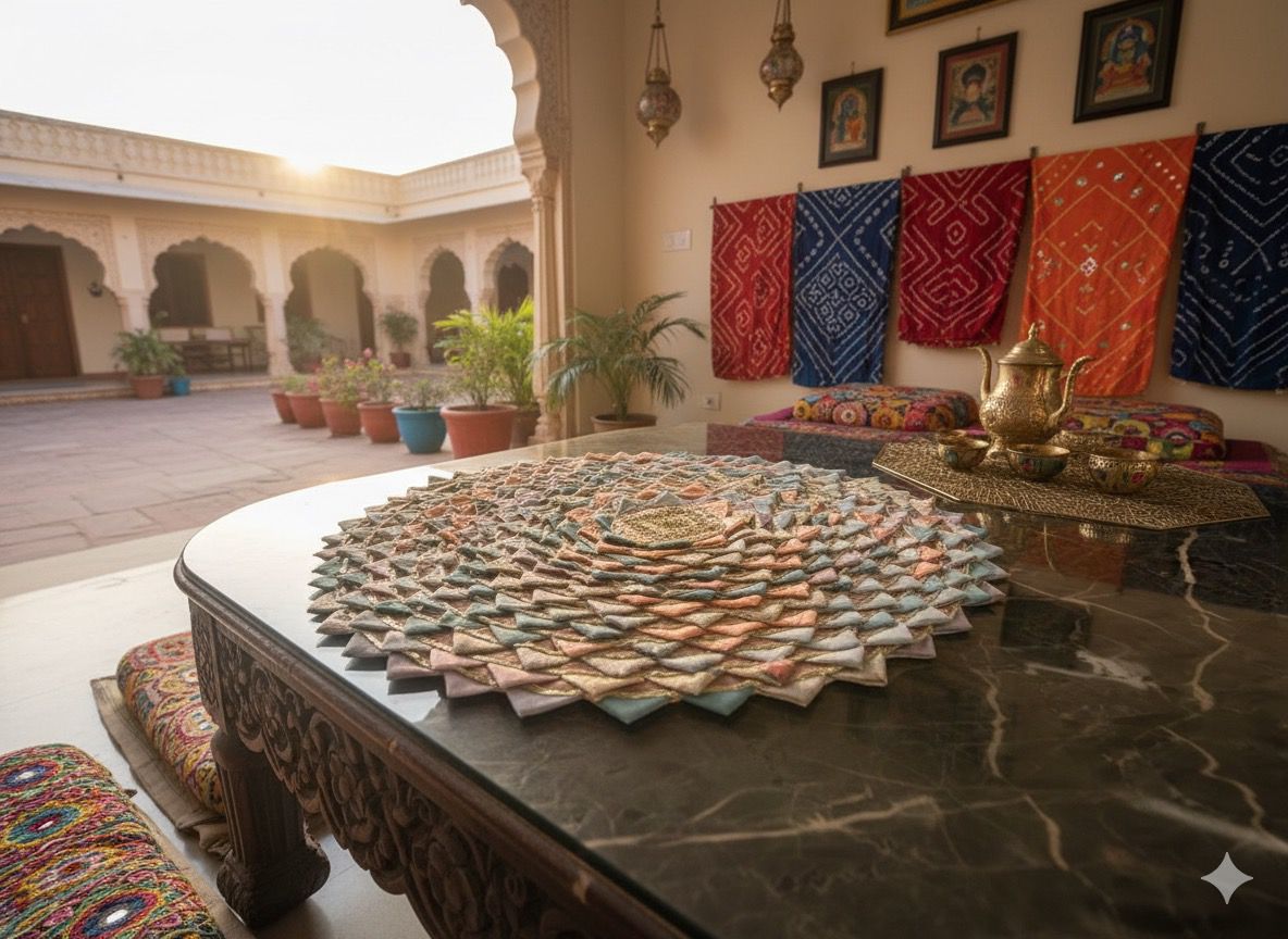 The Satrangi Bloom: Thaalposh unfolds like a blossoming flower, each petal formed from folded silk in pastel shades of rose, aqua, and lavender. Every layer is stitched by hand, carefully aligned so that the concentric rings rise like a lotus in bloom. The silk itself comes from Banaras, woven with silver zari that glimmers faintly against candlelight, while the folded-petal technique is perfected by artisans who spend days assembling each thaalposh into its sculptural form.